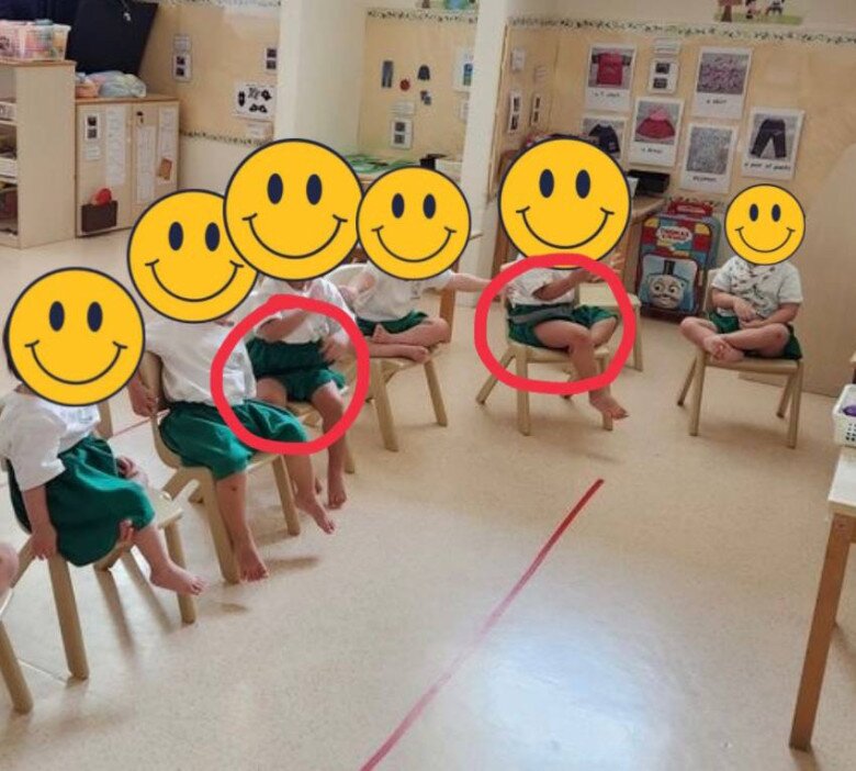 “Khi tôi phóng to bức ảnh, tôi vô cùng kinh ngạc khi thấy một sợi dây an toàn quấn quanh eo đứa con trai 23 tháng tuổi của tôi và một đứa trẻ khác, buộc chặt chúng vào ghế với chân cách mặt đất.” – cô Li kể.