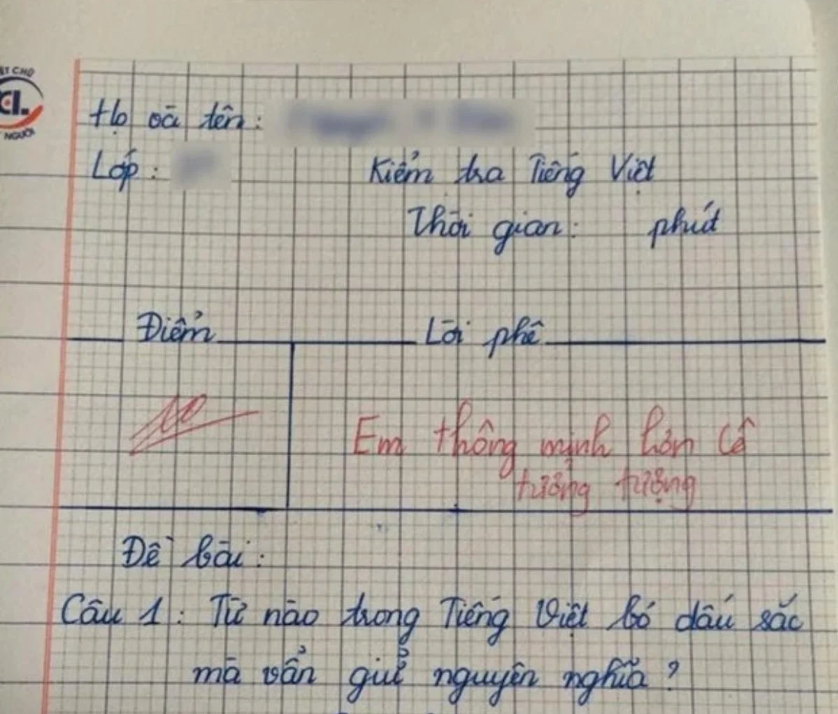 Cụ thể, bé lớp 3 đã nhận được đề bài kiểm tra từ giáo viên với đề bài: “Từ nào trong tiếng Việt bỏ dấu sắc mà vẫn giữ nguyên nghĩa?”. Một câu hỏi tưởng đơn giản, nhưng thực tế lại đòi hỏi học sinh phải tư duy, phân tích và có một lượng từ vựng phong phú thì mới có thể đưa ra được đáp án chính xác nhất.