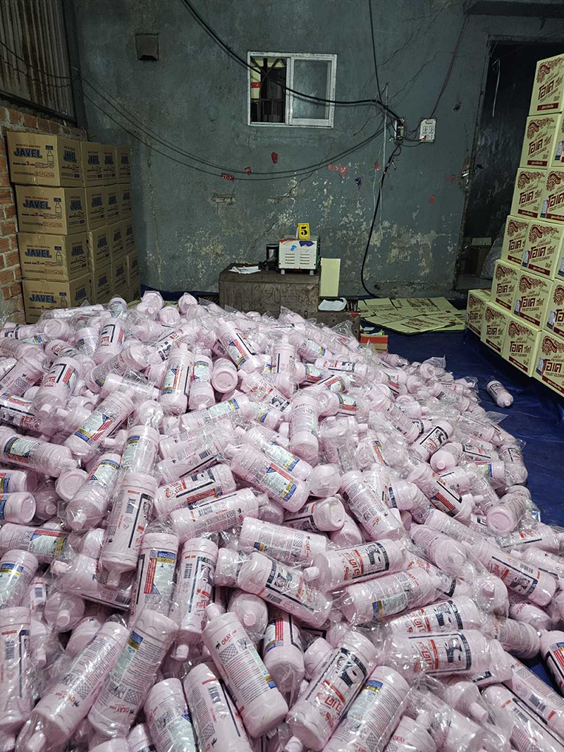 Mở rộng điều tra, công an tiến hành khám xét khẩn cấp cơ sở sản xuất và kho bãi có liên quan, thu giữ hơn 200 thùng nước rửa toilet, nước giặt, nước xả mang nhãn hiệu O.K, D.N, F.L; cùng hàng nghìn vỏ chai, tem nhãn, nắp nhựa và thùng in logo các thương hiệu. Ngoài ra, lực lượng chức năng còn phát hiện máy ép, dây chuyền chiết rót, 4 bồn chứa dung dịch pha chế và nhiều sản phẩm nước tẩy đậm đặc.