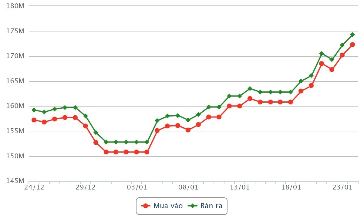 Phiên giao dịch cuối tuần ngày 24/01 chứng kiến đà tăng tiếp diễn của giá vàng trong nước. Sau cú bứt phá ngày hôm qua, vàng miếng và vàng nhẫn đồng loạt tăng thêm từ 1,8 đến hơn 2 triệu đồng/lượng, chốt phiên chiều nay trên mốc 174 triệu đồng/lượng.