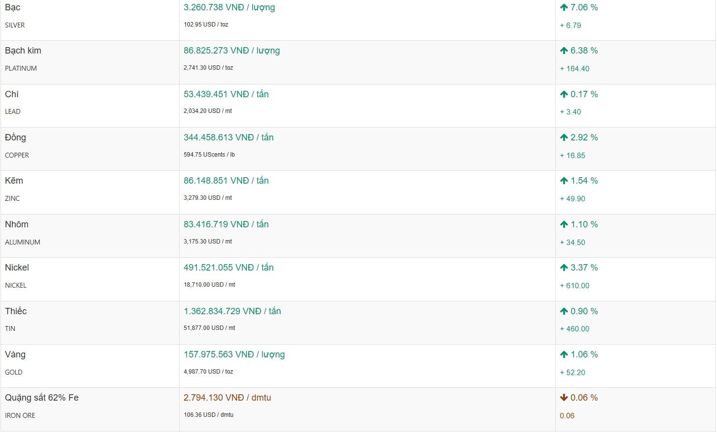 Nhôm có sự biến động tích cực 1,10%, tương đương tăng thêm 34,50 USD/mt và hiện niêm yết tại 83.416.719 VNĐ/tấn.