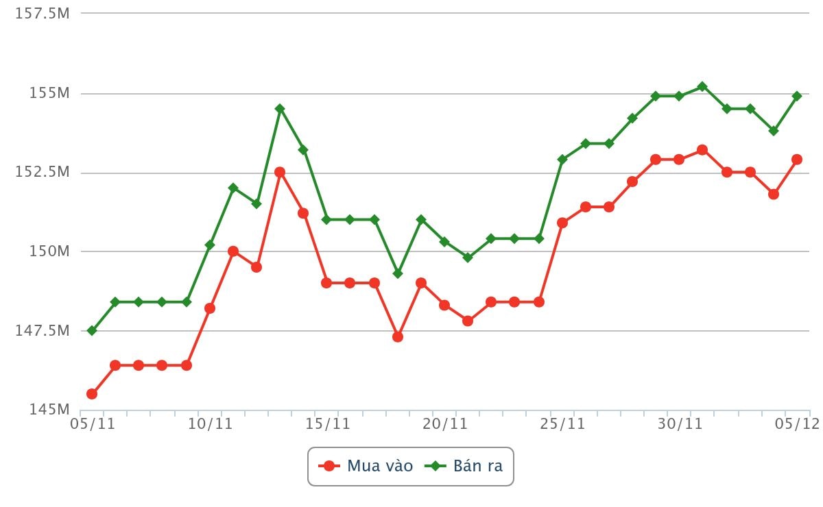 Giá vàng miếng SJC chốt giá mua vào cuối ngày 5/12 ở mức 152,9 triệu đồng/lượng cao hơn phiên trước 1,1 triệu đồng. Giá bán ra chốt ở mức 154,9 triệu đồng/lượng, cao hơn phiên trước 1,1 triệu đồng. 2 chiều mua vào và bán ra chênh lệch 2 triệu đồng.