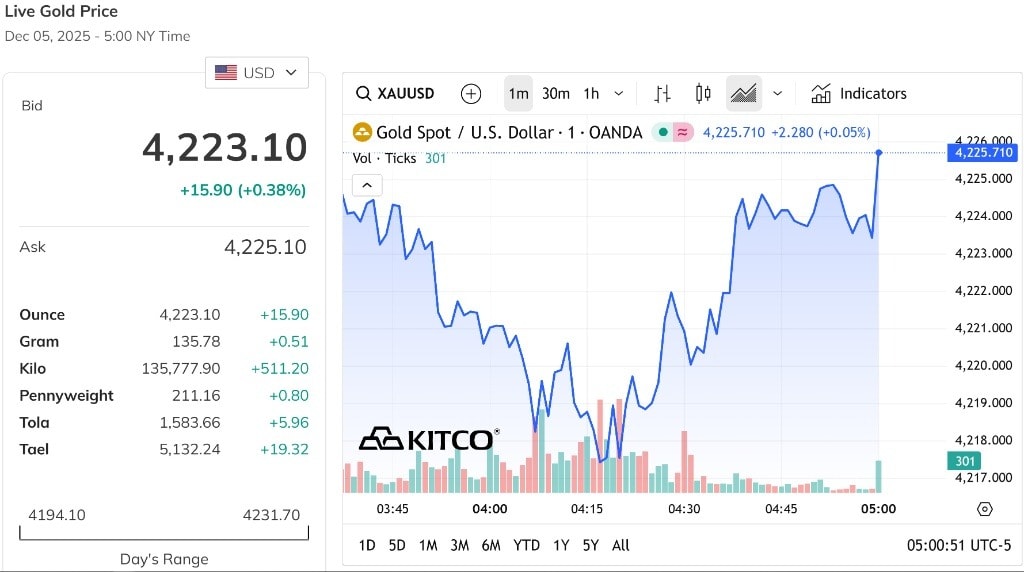 Tính đến 07:17 GMT, vàng giao ngay tăng 0,5%, lên 4.227,35 USD/ounce, dù vẫn hướng đến mức giảm nhẹ 0,1% trong tuần. Hợp đồng vàng giao tháng 12 trên sàn Mỹ cũng nhích 0,4%, đạt 4.257,90 USD/ounce.