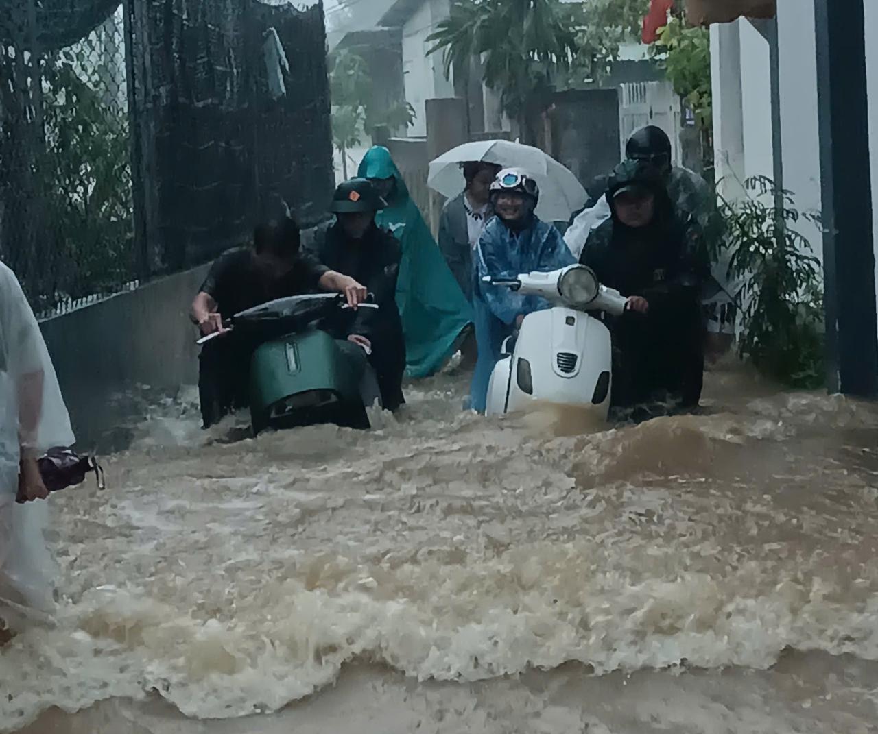 Trong đó, khu vực xóm Gióng, đường Nguyễn Hữu Cảnh, phường An Cựu, TP Huế bị ngập sâu nhất. Nước chảy xiết khiến người và các phương tiện giao thông qua lại rất khó khăn.