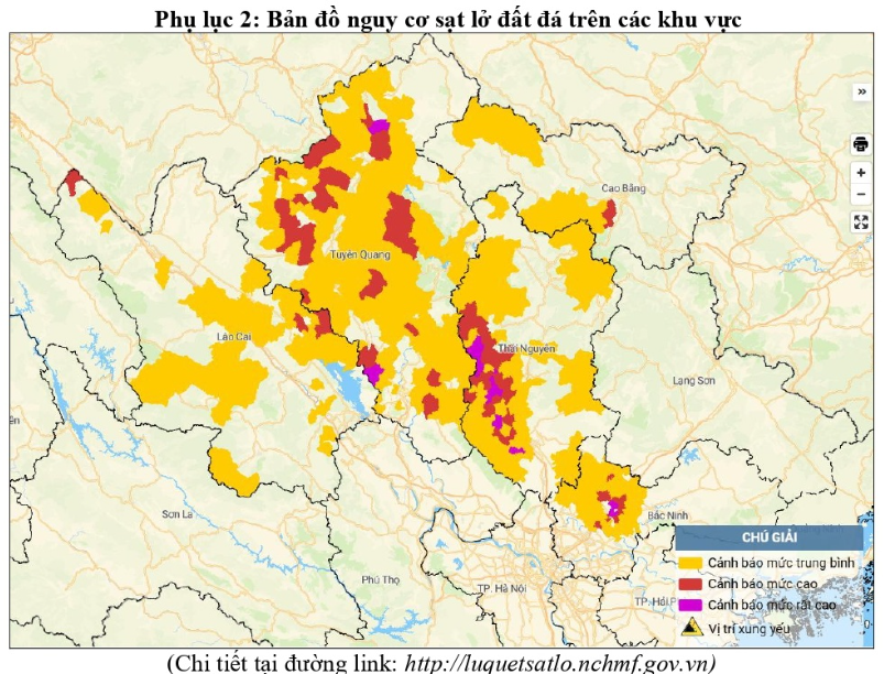 Do trong thời gian qua, các tỉnh vùng núi phía Bắc liên tục có mưa lớn kéo dài, đất đá đã ngấm no nước, mực nước lũ trên các sông vẫn còn cao nên nguy cơ xảy ra sạt lở đất vẫn ở mức cao, kể cả khi mưa đã giảm hoặc tạm ngớt. Trong 6 giờ tới, nhiều xã, phường thuộc khu vực sườn dốc được cảnh báo có khả năng xảy ra sạt lở đất (chi tiết được nêu trong Phụ lục 1).